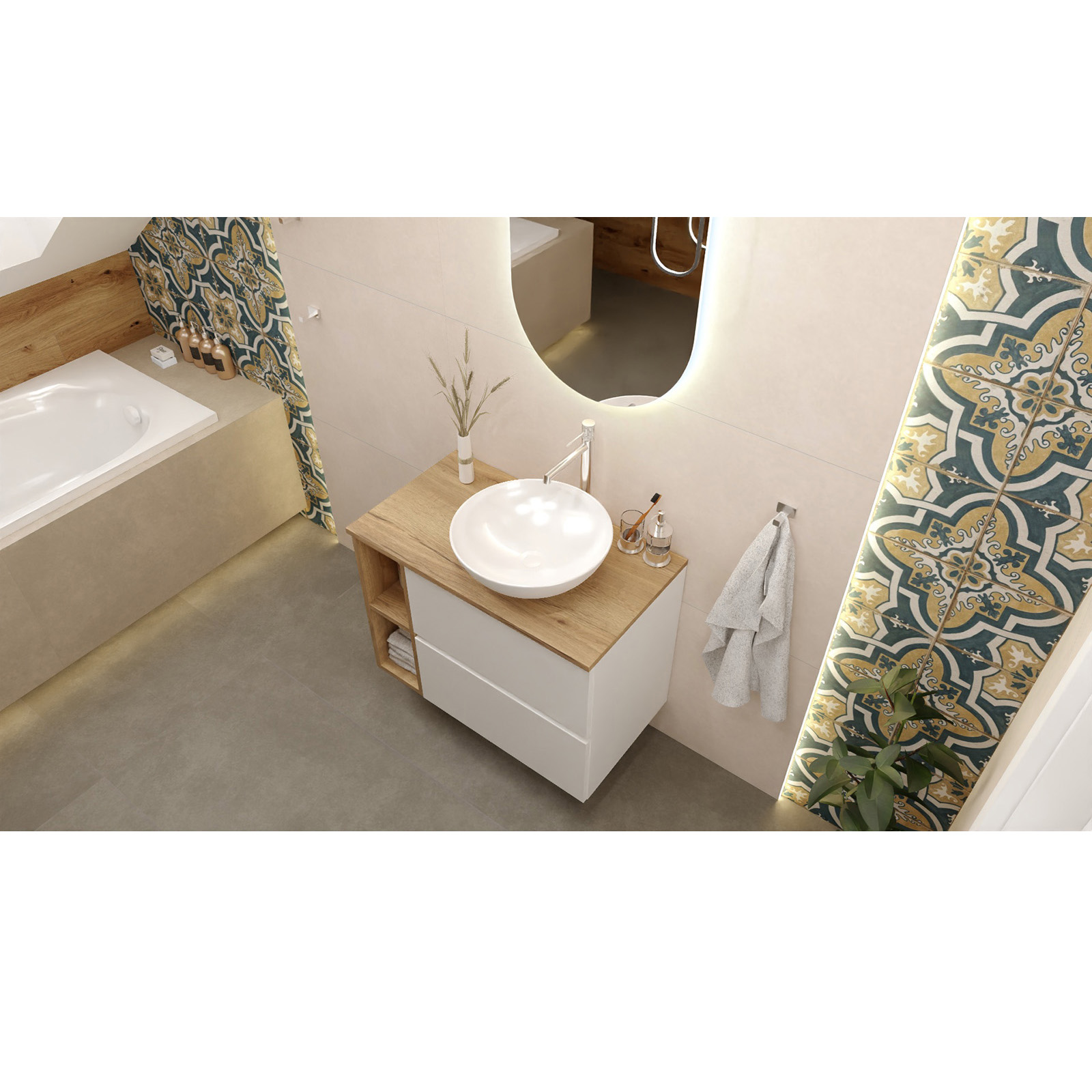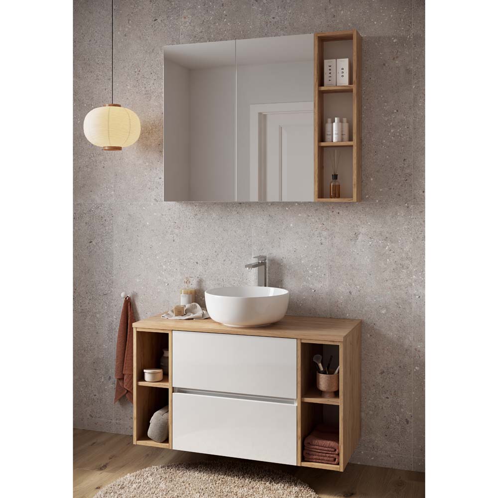 MALTA umyvadlová skříňka otevřený modul dub DSM Elegantní, funkční a nadčasová - to je kolekce nábytku Malta. Bílý nábytek se díky bezúchytkovým čelům bude hodit do každé koupelny bez ohledu na styl. Horní deska a další prvky v barvě světlého dřeva se hodí ke každému stylu koupelny.
