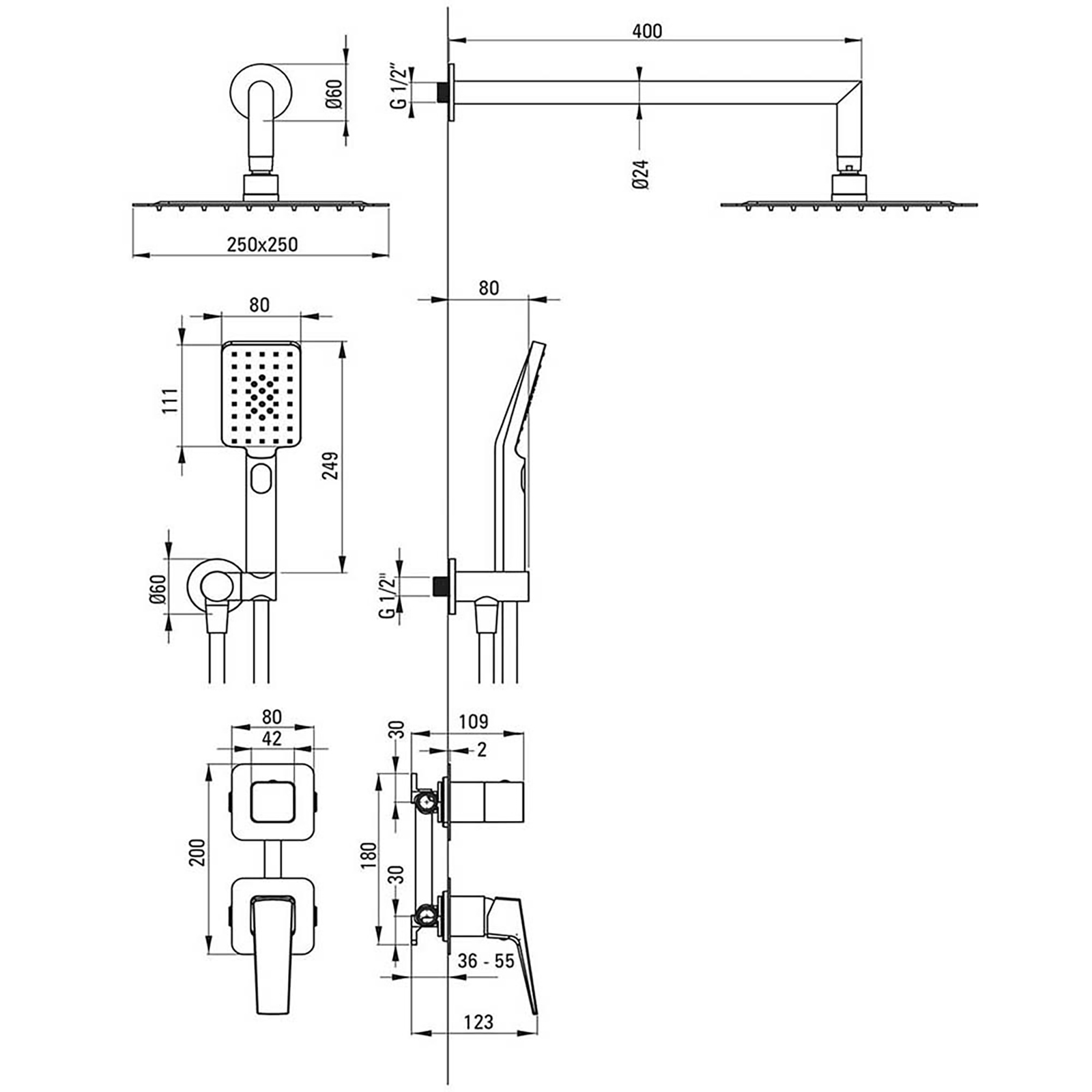 zapuštěná sprchová sada Elegantní zapuštěná sprchová sada sestávající z hlavice, sprchové hlavice s šikmým připojením a hadice a kohoutku. Čtvercová rozprašovací hlava zajišťuje rovnoměrný a pohodlný průtok vody pro relaxační koupelový zážitek. Vyroben z kvalitních materiálů, je odolný a odolný proti korozi. Sada je také vybavena skrytým kohoutkem s ergonomickou pákou, která umožňuje přesně nastavit teplotu a intenzitu vodního trysku. Celé je obloženo chromem, dokonale ladí jak s moderním, tak klasickým koupelnovými uspořádáním. Díky zapuštěnému designu jsou instalační prvky nenápadně skryté, což koupelně dodává minimalistický a upravený vzhled.