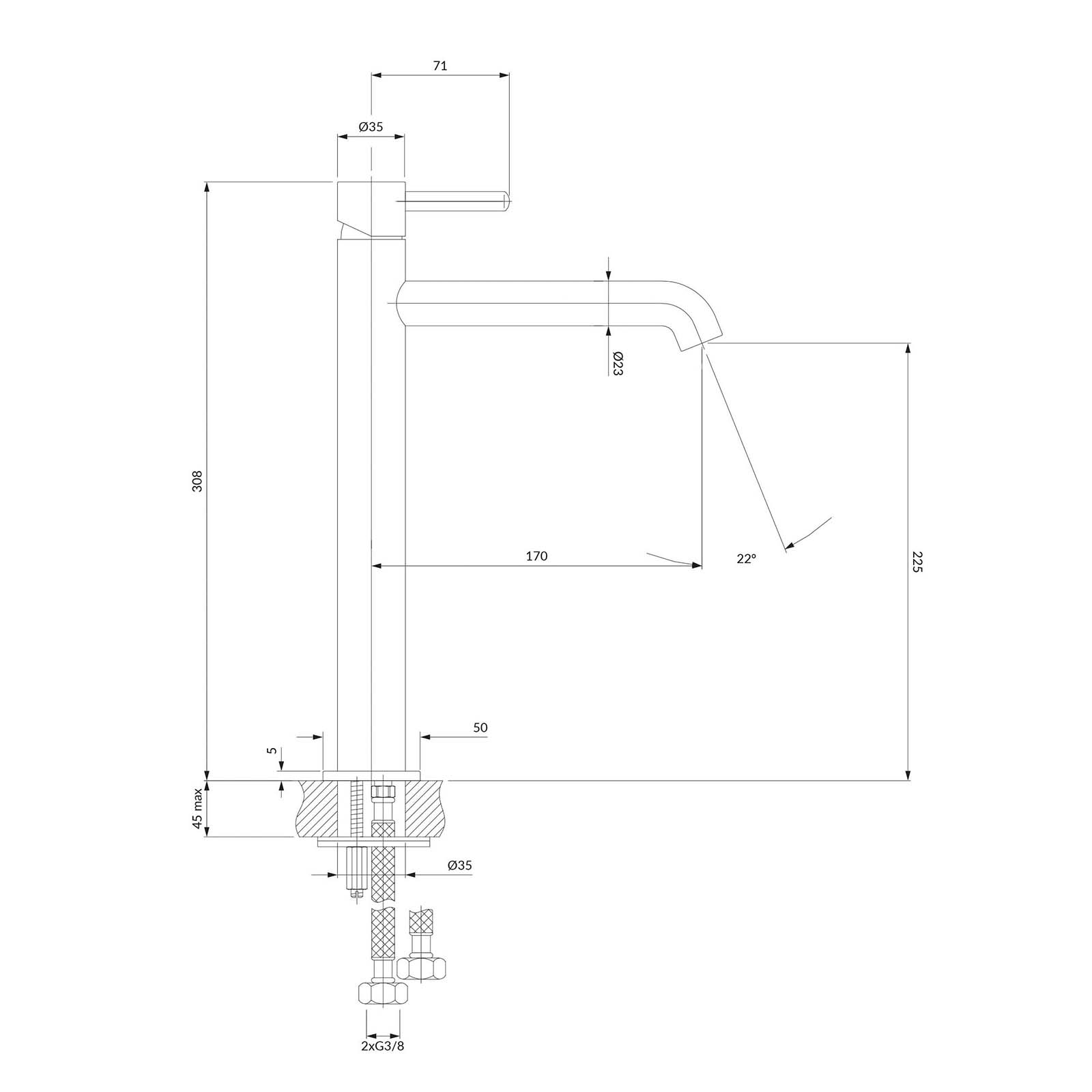 - Výška vývodu: 22,5 cm