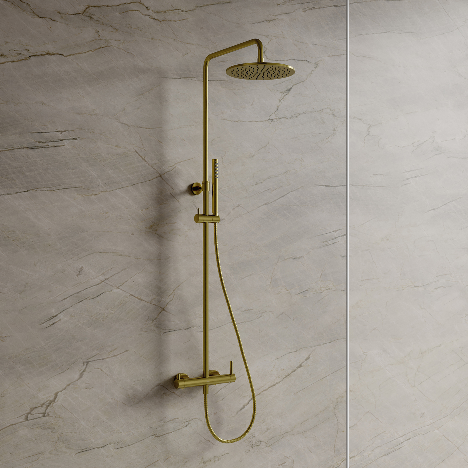 Sprchový systém Y povrchově montované broušené mosazi.