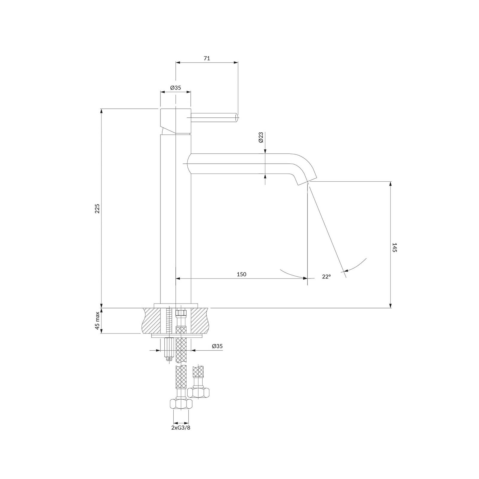- Celková výška kohoutku: 22,5 cm